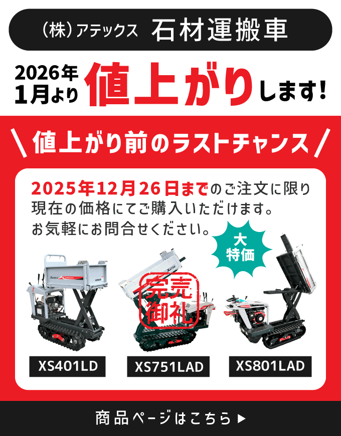 緊急告知!!(株)アテックス製石材運搬車値上がりします!!