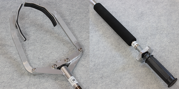 1.支持グリップを持ち、操作グリップを押してください。保持用アームが開きます。