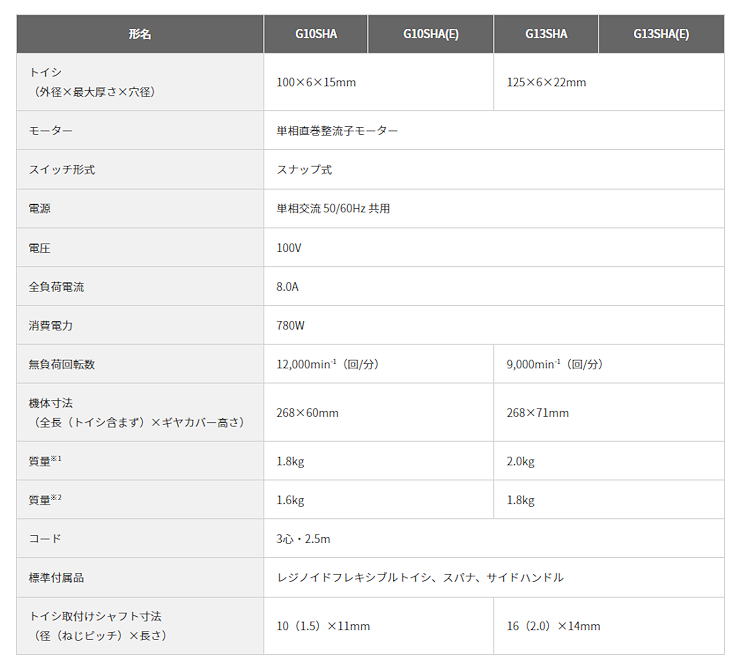 標準付属品:レジノイドフレキシブルトイシ・スパナ・サイドハンドル