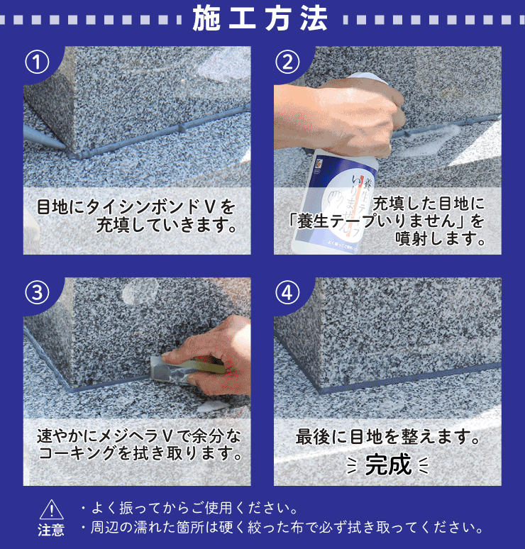 @目地にタイシンボンドVを充填後、充填後の目地に「養生テープいりません」を噴射します。